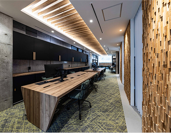 ビルの外観は一つ一つ本物の丸太から型を取った木目の外壁に、豊かな緑が広がり、自然の美しさと癒しを都会に取り入れたデザインです。オフィスフロアはウッドを基調としたホテルライクな作りで、洗練された空間の中にぬくもりを感じられます。開放感のある屋上もあり、緑とデザイン性溢れるクリエイティブな環境でお仕事をおこなっていただけます。
